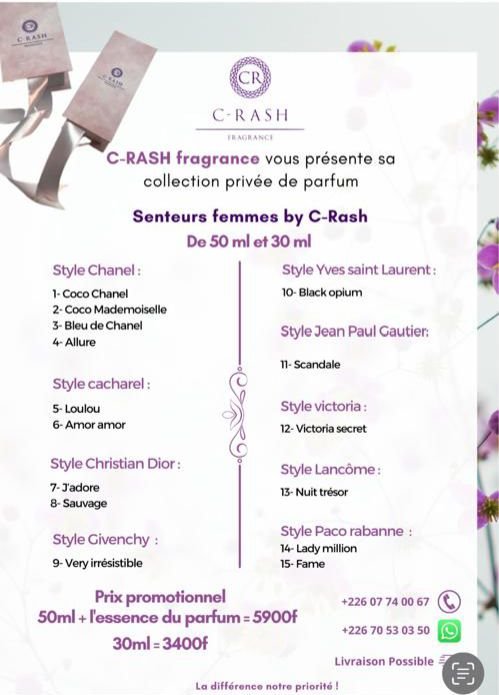 Offrir des parfums artisanaux de qualité, conçus au Maroc avec des ingrédients nobles, Avec aussi des parfum authentique de grande marque de fragrance, pour sublimer l’identité et la confiance de chacun au Burkina Faso. C-RASH Fragrance s’engage à allier authenticité, élégance et accessibilité à travers une expérience olfactive unique.